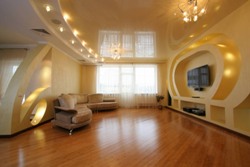 МатовыйДанный вариант является наиболее дешевым и очень похожим на оштукатуренную поверхность или на гипсокартонный потолок. Он неплохо впишется в любой интерьер, и особенно подойдет любителям классического стиля. Такой материал не отражает блики от света, не надоедает глазам и не тускнет со временем. Он придаст гостиной комфорт, теплоту и мягкость. Но при этом палитра цветов маленькая, кроме того потолок выглядит слишком официально и ограничивает возможности в оформлении комнаты. ГлянцевыйГлянец отражает свет и тем самым визуально расширяет комнату, работая, словно зеркало внутри нее, поэтому натяжные потолки от potolkilider.ru применяют преимущественно для помещений небольших размеров. Одно из главных достоинств, глянцевого потолка является износостойкость, а также длительный эксплуатационный период. Есть возможность нанести на его поверхность какой-нибудь интересный рисунок или наклейку. Также он позволяет легко и быстро осуществить монтаж осветительных приборов, которые можно оборудовать в перекрытие между основным и натяжным потолком. К сожалению, ширина полотна составляет, как правило, не больше двух метров, поэтому при его установке в большой гостиной могут возникнуть проблемы. На нем видны швы, пятна и царапины – это довольно существенный минус, который может негативно повлиять на общий интерьер. Материал тяжело переносит холод, так что воспрещается оборудовать такой потолок в помещениях, где нет отопления продолжительное время. СатиновыйЭто что-то среднее между 2-мя предыдущими видами натяжных потолков. Внешне он похож на матовое полотно, но при этом способен отражать свет. Сатин обеспечит уютную обстановку в гостиной, придаст ей теплоты и обогатит ее интерьер. Существуют варианты с перламутровой расцветкой, которые пользуются особым спросом и обладают бархатистой поверхностью. Стоимость на сатиновый потолок довольно высокая, что является основным его минусом. В остальном он не имеет явных изъянов и не требует постоянного ухода. |